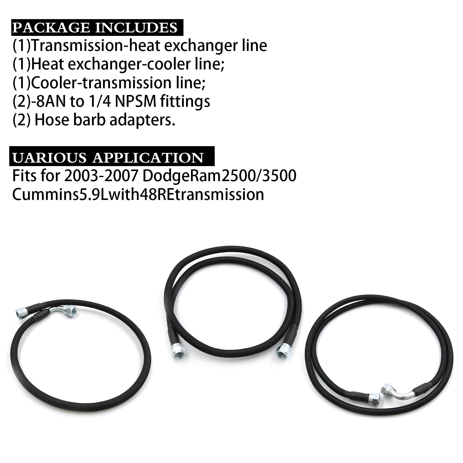 Fitment:This set of SS Braided Transmission Cooler Hoses Lines fit for 2003-2007 Dodge Ram Cummins 5.9L with 48RE Transimission.